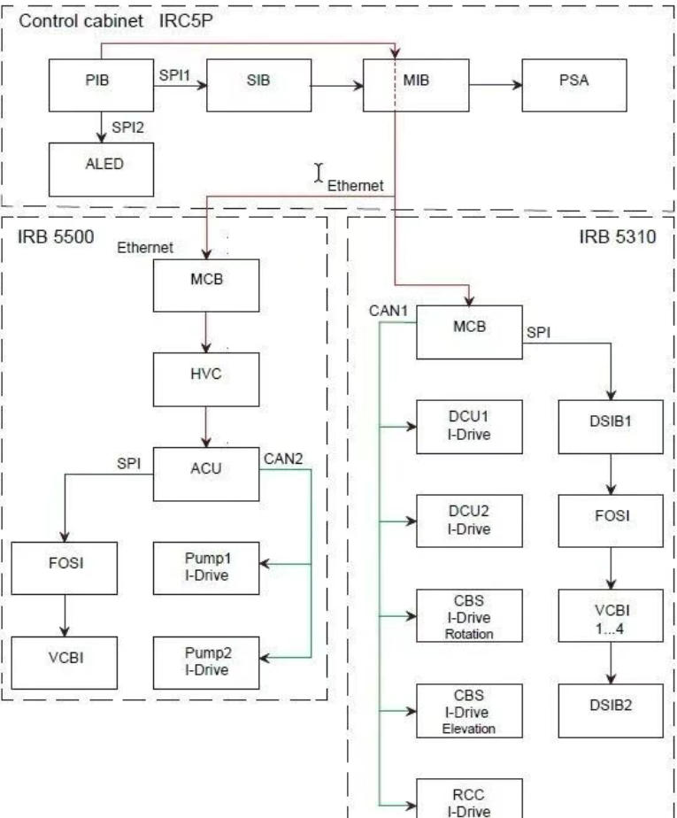 ABB 喷涂机器人常用 Profibus、Profinet、MODBUS TCP 三种通讯方式适配不同工业场景,以下结合实际应用场景整理对应的通讯原理图范例及核心说明,可清晰体现各部件连接逻辑与数据交互路径: