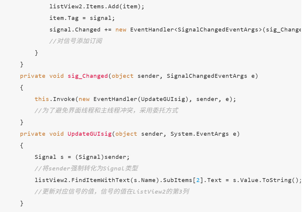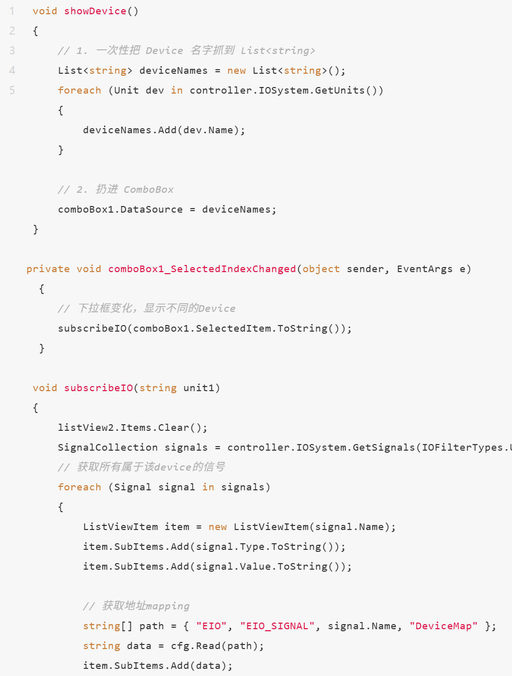 上位机通过PCSDK,可以订阅I/O信号(值变化同步显示)。信号相关内容可以在IOSystemDomain找到,例如Signal类下。但Signal类只有信号的名称,值,所属设备等。没有该信号的对应地址。要获取信号的地址,可以通过ConfigurationDomain获取,即通过信号的名称,读取配置文件EIO中的EIO_Signal下的信号的DeviceMap 获取。根据上图,创建comboBox和listView,并编写如下代码。可以在上位机连接上机器人后,先调用一次showDevice,填充下拉框的device名字。