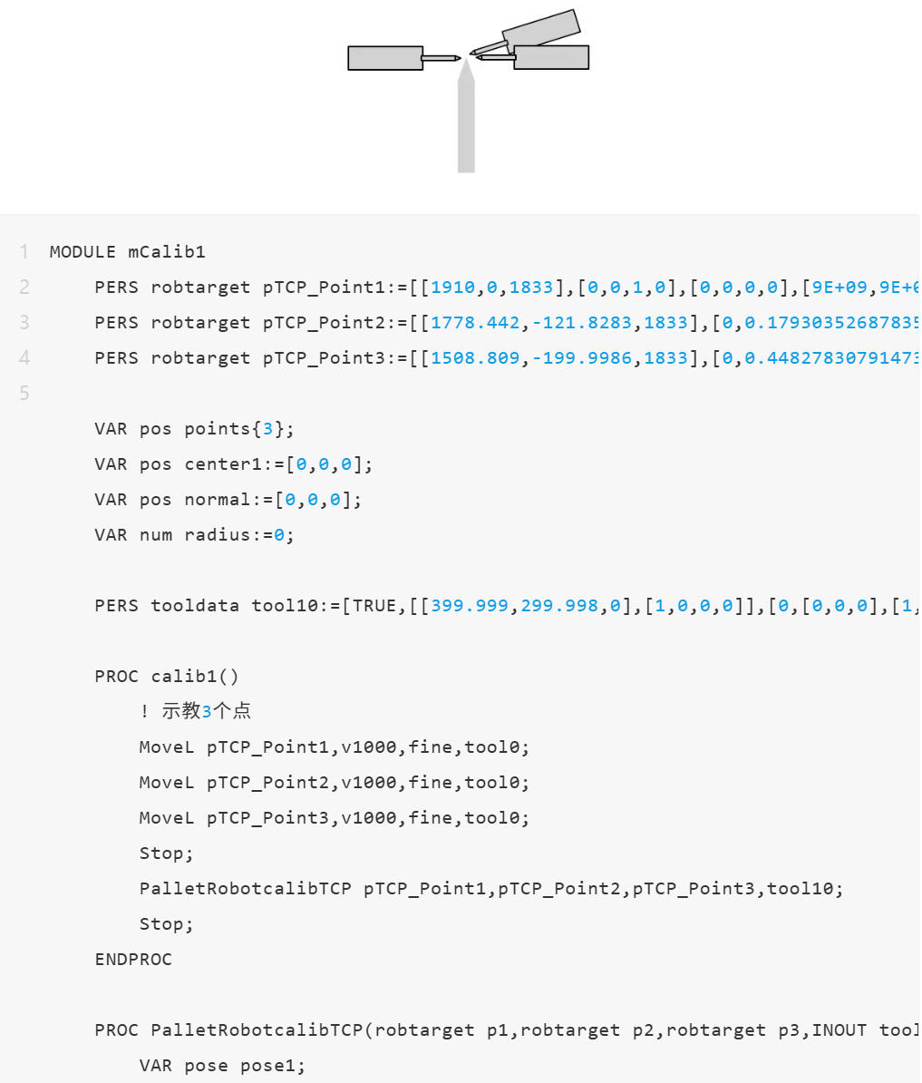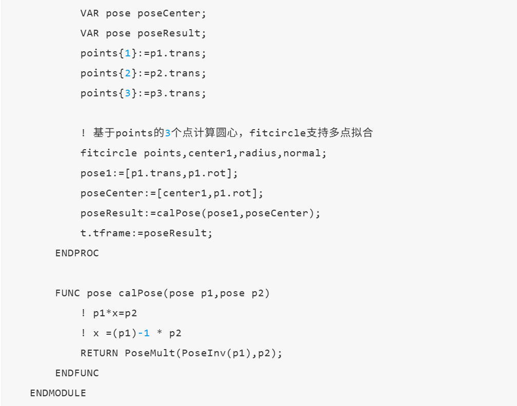 2. ABB机器人的TCP标定界面,暂时无法对4轴码垛机器人的TCP进行标定。3. 对于4轴码垛机器人,TCP数据只有x,y和Rz。 Z方向可以认为根据实际输入。4. 对于此类TCP,可以让机器人末端工具针尖,绕着固定点移动旋转,并记录3个点(3点求圆心,也可以多个点拟合圆心)。5. 参考下方代码计算:
