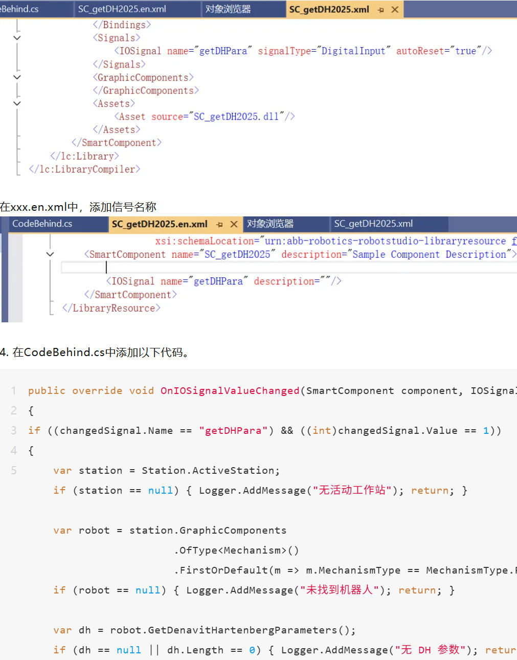 1. 下载RobotStudio SDK:https://developercenter.robotstudio.com/robotstudio-sdk, 并安装; 2. 打开Visual Studio,新建一个Smart组件项目; 3. 在xxx.xml中,参考下图添加按钮和相关属性。