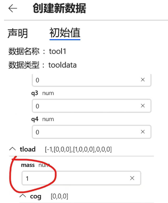 此时需要注意设置mass的初始值>0,不然运行负载标定程序会报错,此处随便设置一个正数即可,这里设为1: